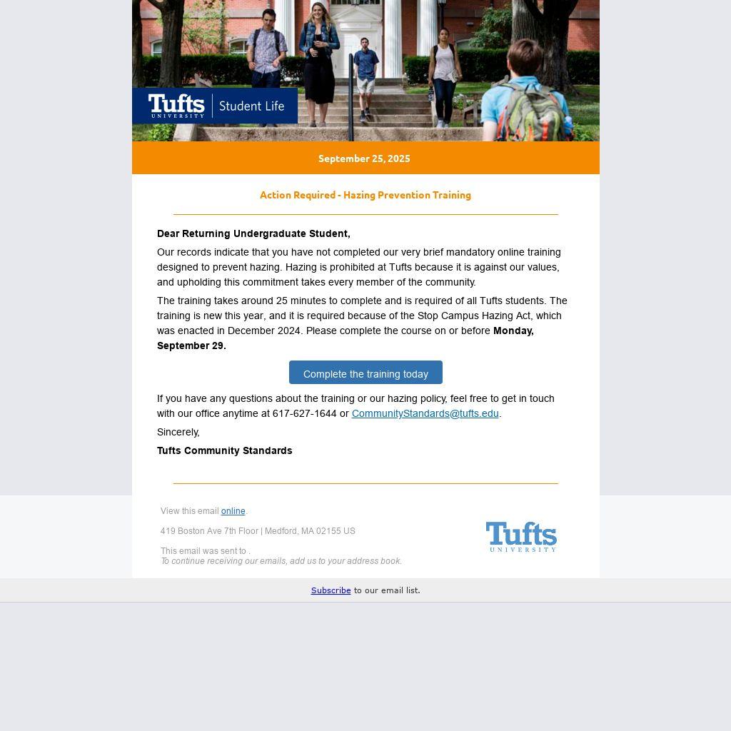 The training takes around 25 minutes to complete and is required of all Tufts students. The training is new this year, and it is required because of the Stop Campus Hazing Act, which was enacted in December 2024. Please complete the course on or before Monday, September 29.