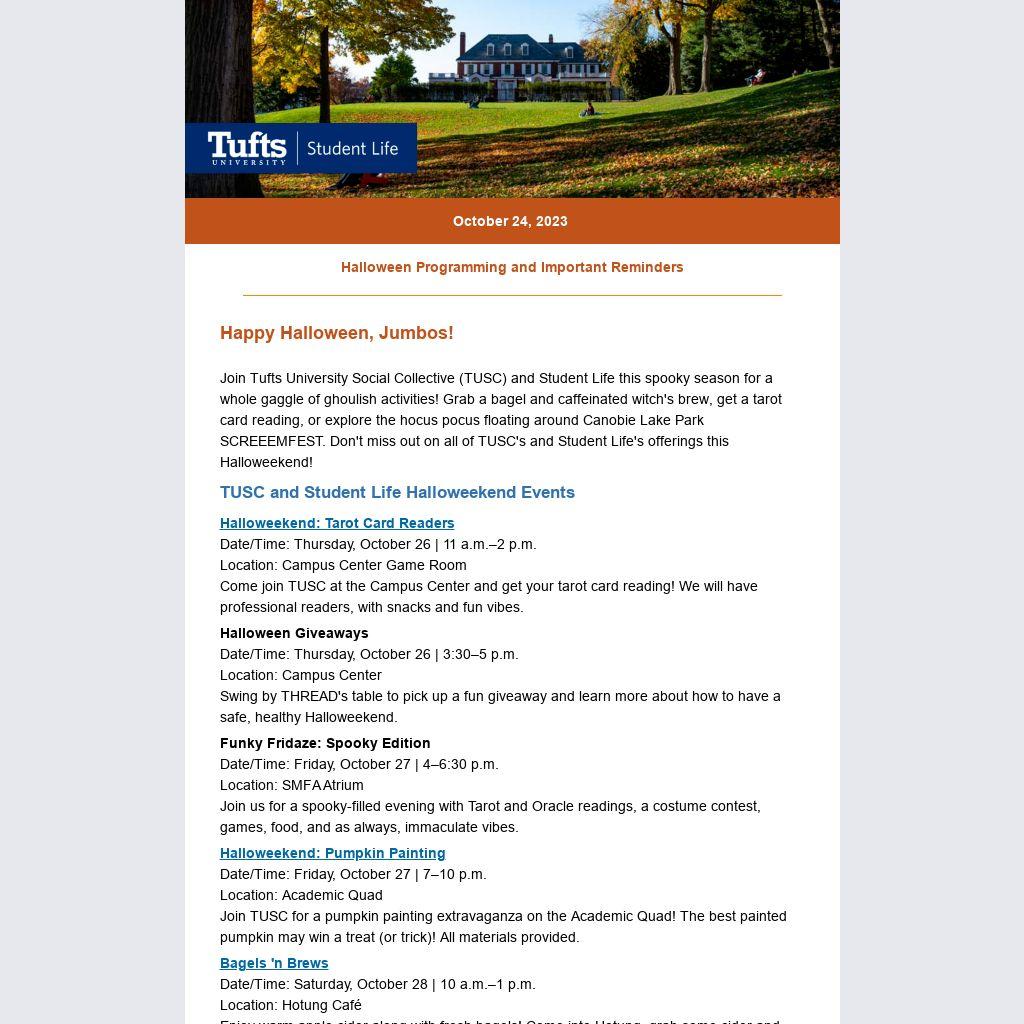 Spooky movies, trivia, floor parties, trick-or-treating, pumpkin carving, and more! Look out for communication from your RA with Halloween programming opportunities in your community!