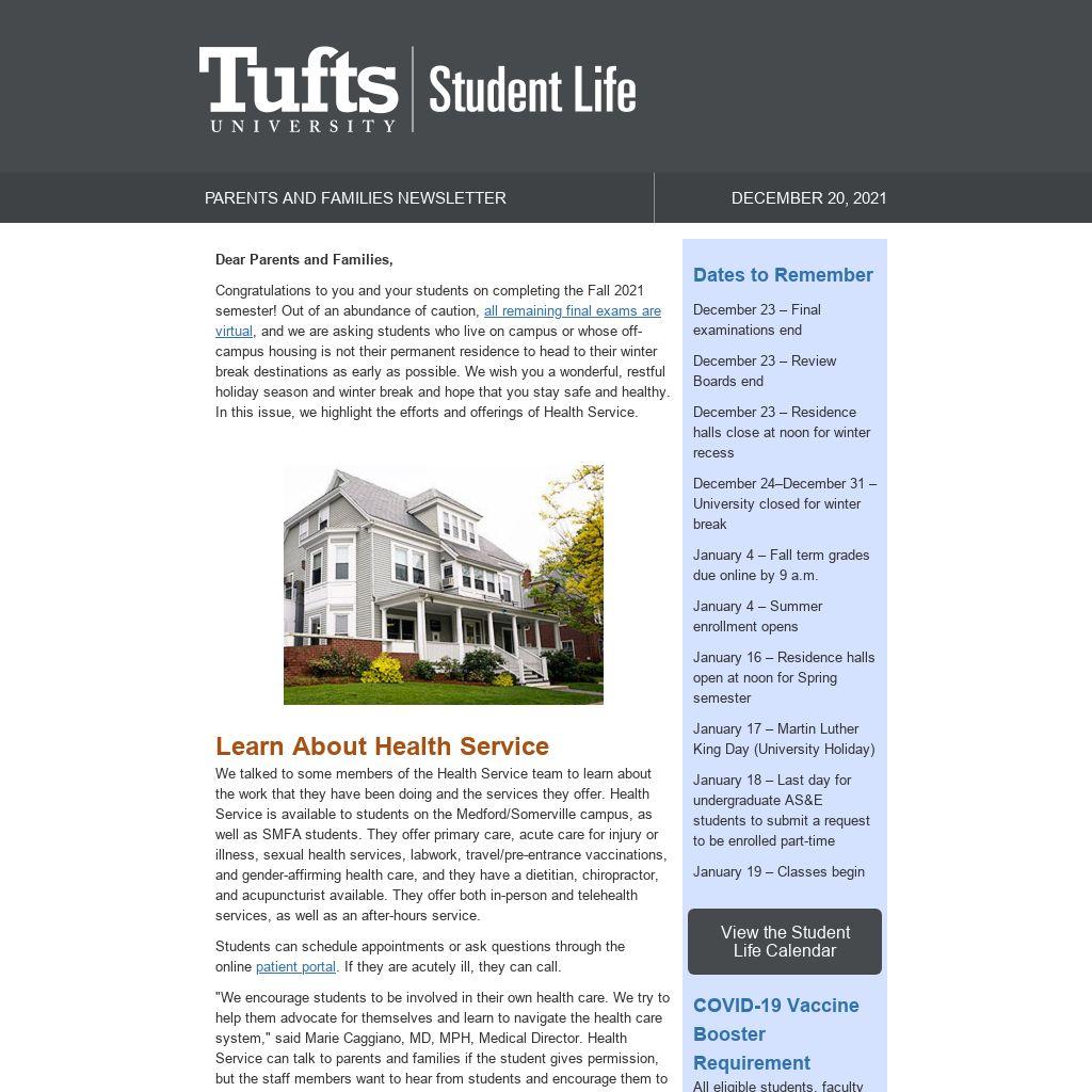 Health Service strongly recommends that all students get a flu vaccine, and COVID booster shots are now required for all members of the Tufts community; students can get these vaccinations when they are home for winter break if they haven't already.