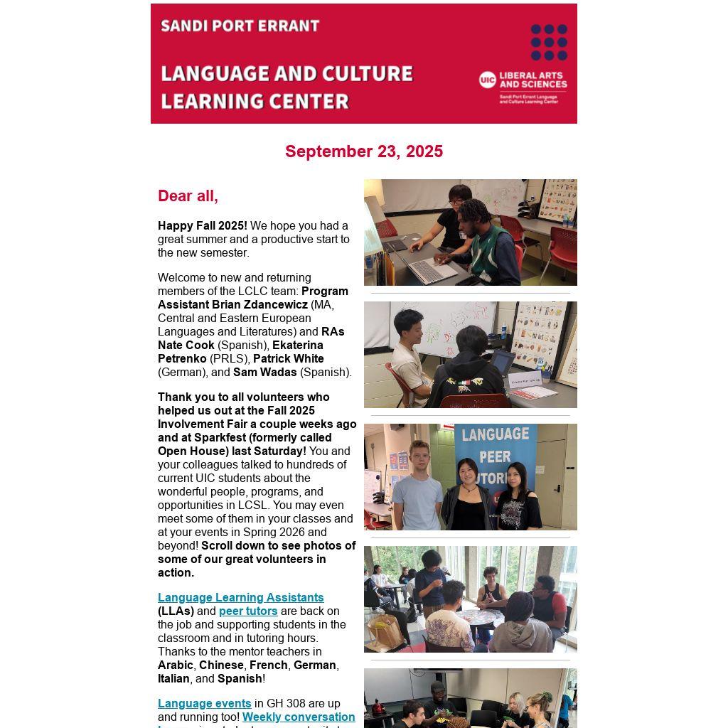 Thank you to all volunteers who helped us out at the Fall 2025 Involvement Fair a couple weeks ago and at Sparkfest (formerly called Open House) last Saturday! You and your colleagues talked to hundreds of current UIC students about the wonderful people, programs, and opportunities in LCSL. You may even meet some of them in your classes and at your events in Spring 2026 and beyond! Scroll down to see photos of some of our great volunteers in action.