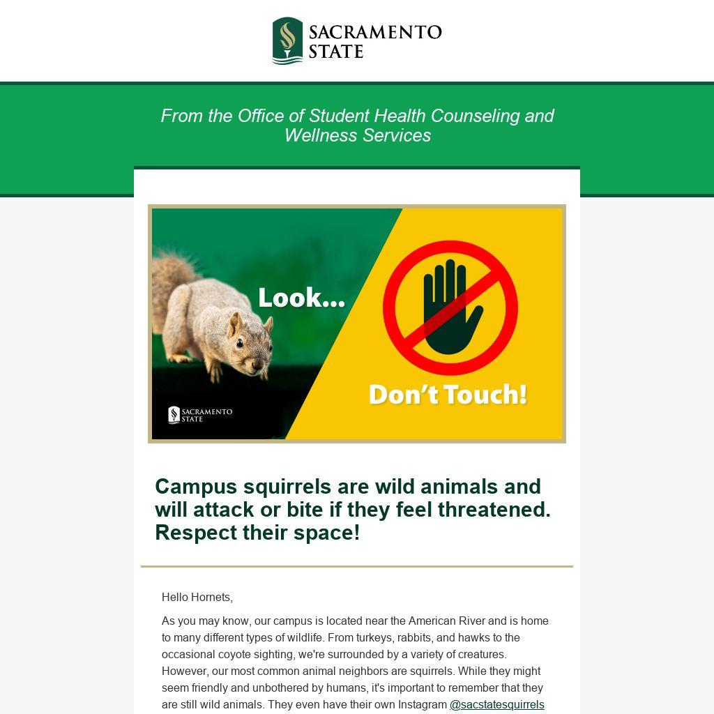 As you may know, our campus is located near the American River and is home to many different types of wildlife. From turkeys, rabbits, and hawks to the occasional coyote sighting, we're surrounded by a variety of creatures. However, our most common animal neighbors are squirrels. While they might seem friendly and unbothered by humans, it's important to remember that they are still wild animals. They even have their own Instagram
