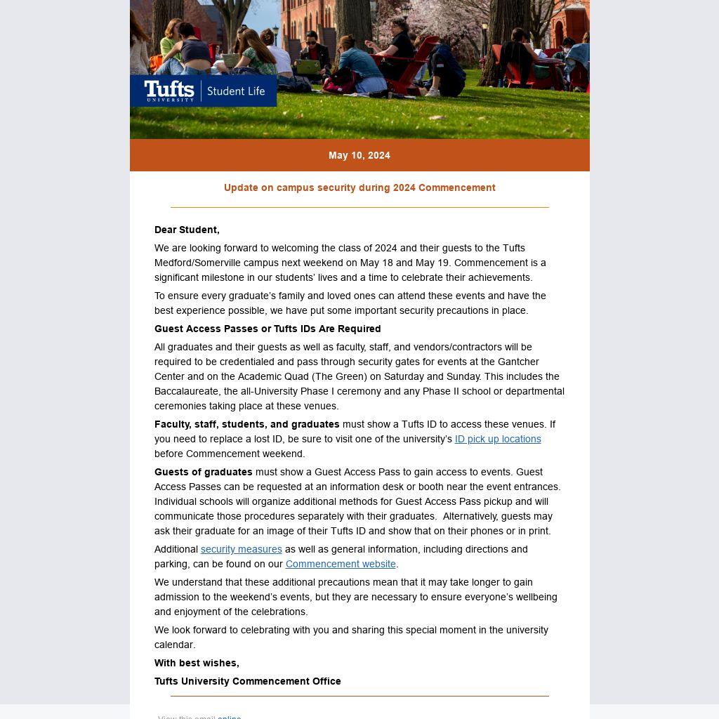 We are looking forward to welcoming the class of 2024 and their guests to the Tufts Medford/Somerville campus next weekend on May 18 and May 19. Commencement is a significant milestone in our students’ lives and a time to celebrate their achievements.