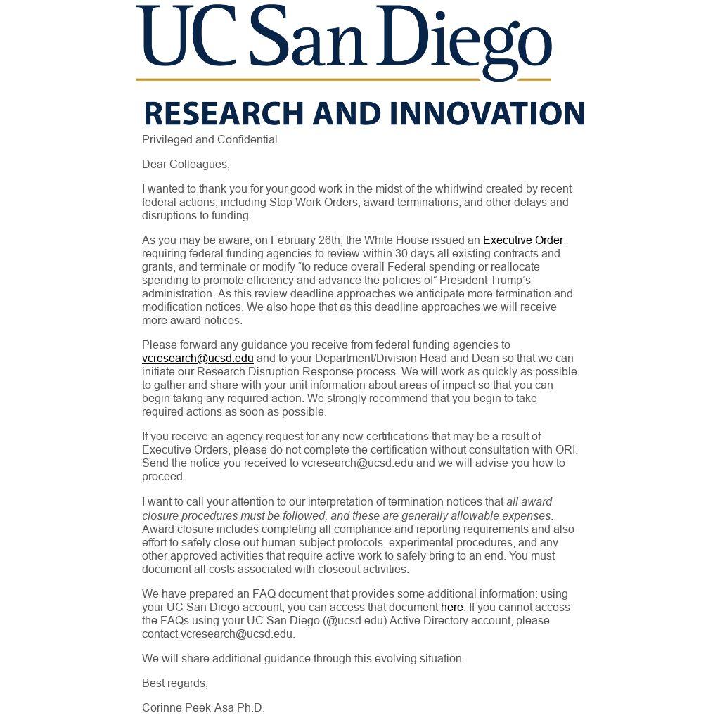 Please forward any guidance you receive from federal funding agencies to vcresearch@ucsd.edu and to your Department/Division Head and Dean so that we can initiate our Research Disruption Response process. We will work as quickly as possible to gather and share with your unit information about areas of impact so that you can begin taking any required action. We strongly recommend that you begin to take required actions as soon as possible.