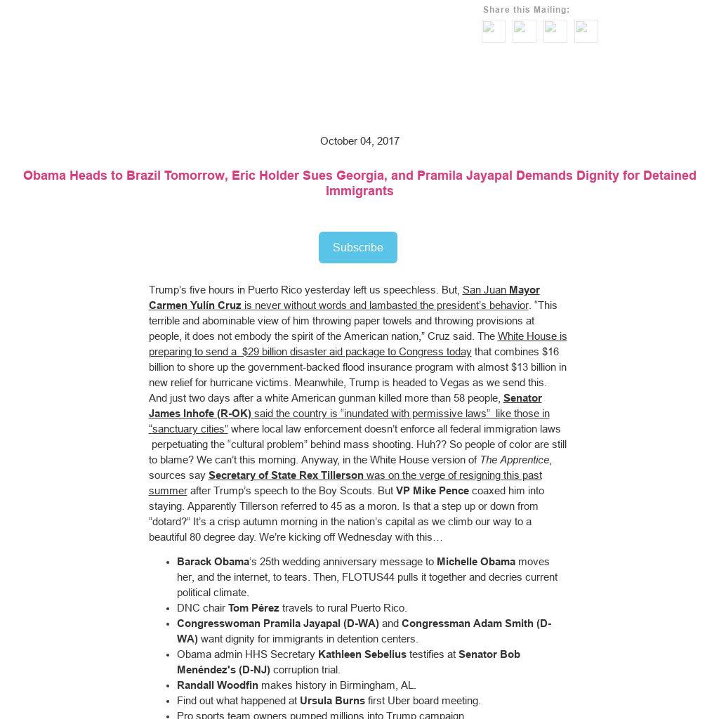 Trump’s five hours in Puerto Rico yesterday left us speechless. But, San Juan Mayor Carmen Yulín Cruz is never without words and lambasted the president’s behavior. “This terrible and abominable view of him throwing paper towels and throwing provisions at people, it does not embody the spirit of the American nation,” Cruz said. The White House is preparing to send a $29 billion disaster aid package to Congress today that combines $16 billion to shore up the government-backed flood insurance program with almost $13 billion in new relief for hurricane victims. Meanwhile, Trump is headed to Vegas as we send this. And just two days after a white American gunman killed more than 58 people, Senator James Inhofe (R-OK) said the country is “inundated with permissive laws” like those in “sanctuary cities” where local law enforcement doesn’t enforce all federal immigration laws perpetuating the “cultural problem” behind mass shooting. Huh?? So people of color are still to blame? We can’t this morning. Anyway, in the White House version of The Apprentice, sources say Secretary of State Rex Tillerson was on the verge of resigning this past summer after Trump’s speech to the Boy Scouts. But VP Mike Pence coaxed him into staying. Apparently Tillerson referred to 45 as a moron. Is that a step up or down from “dotard?” It’s a crisp autumn morning in the nation’s capital as we climb our way to a beautiful 80 degree day. We’re kicking off Wednesday with this…