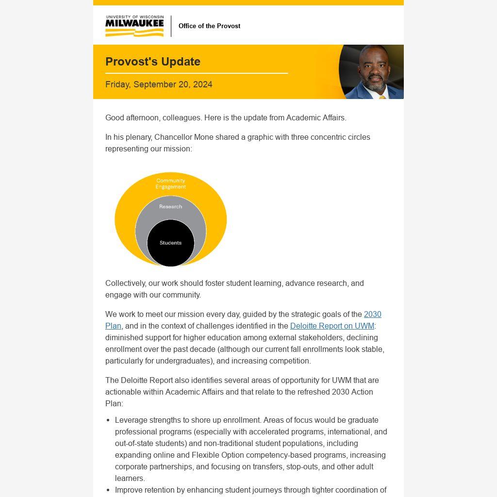 We work to meet our mission every day, guided by the strategic goals of the 2030 Plan, and in the context of challenges identified in the Deloitte Report on UWM: diminished support for higher education among external stakeholders, declining enrollment over the past decade (although our current fall enrollments look stable, particularly for undergraduates), and increasing competition.