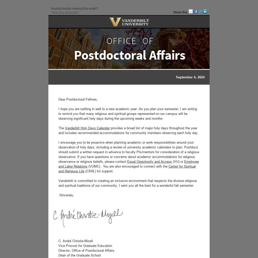 Vanderbilt is committed to creating an inclusive environment that respects the diverse religious and spiritual traditions of our community. I wish you all the best for a wonderful fall semester.