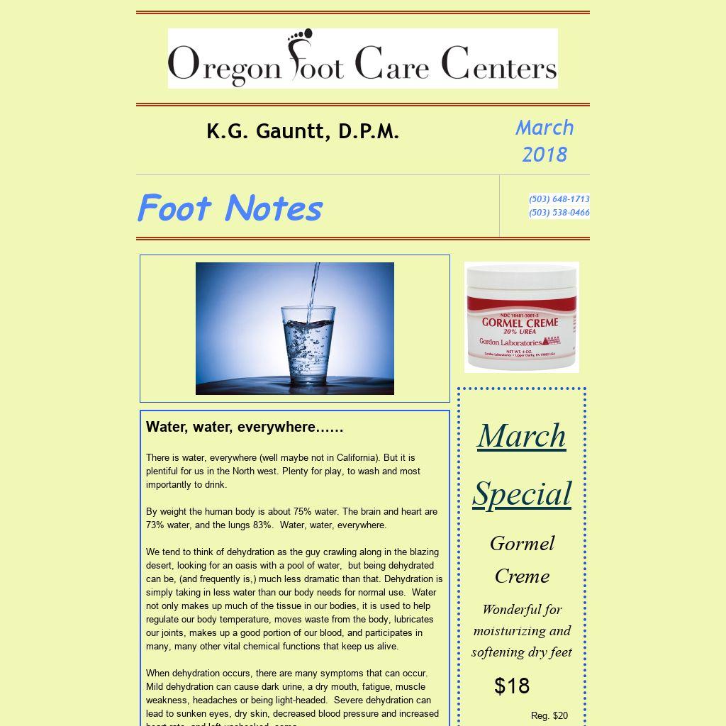 So why the concern with the feet? First of all, the feet are connected to the rest of the body therefore suffer a similar fate. The primary conditions seen with dehydration, directly related to the feet and legs, are muscle weakness and more frequently muscle cramps. Muscle cramps are often vague in cause and difficult, at best, to control. We sometimes, simply cannot find a source for them. However, the easiest thing to try and very commonly results in reduction or solving leg and foot cramps (particularly those at night) is to increase your water intake. Muscles in dehydration can cramp, rehydration is easy and may be of great benefit.