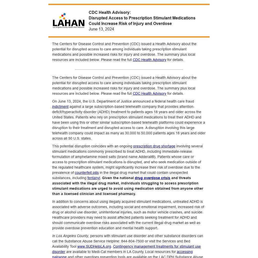 The Centers for Disease Control and Prevention (CDC) issued a Health Advisory about the potential for disrupted access to care among individuals taking prescription stimulant medications and possible increased risks for injury and overdose. The summary plus local resources are included below. Please read the full CDC Health Advisory for details.