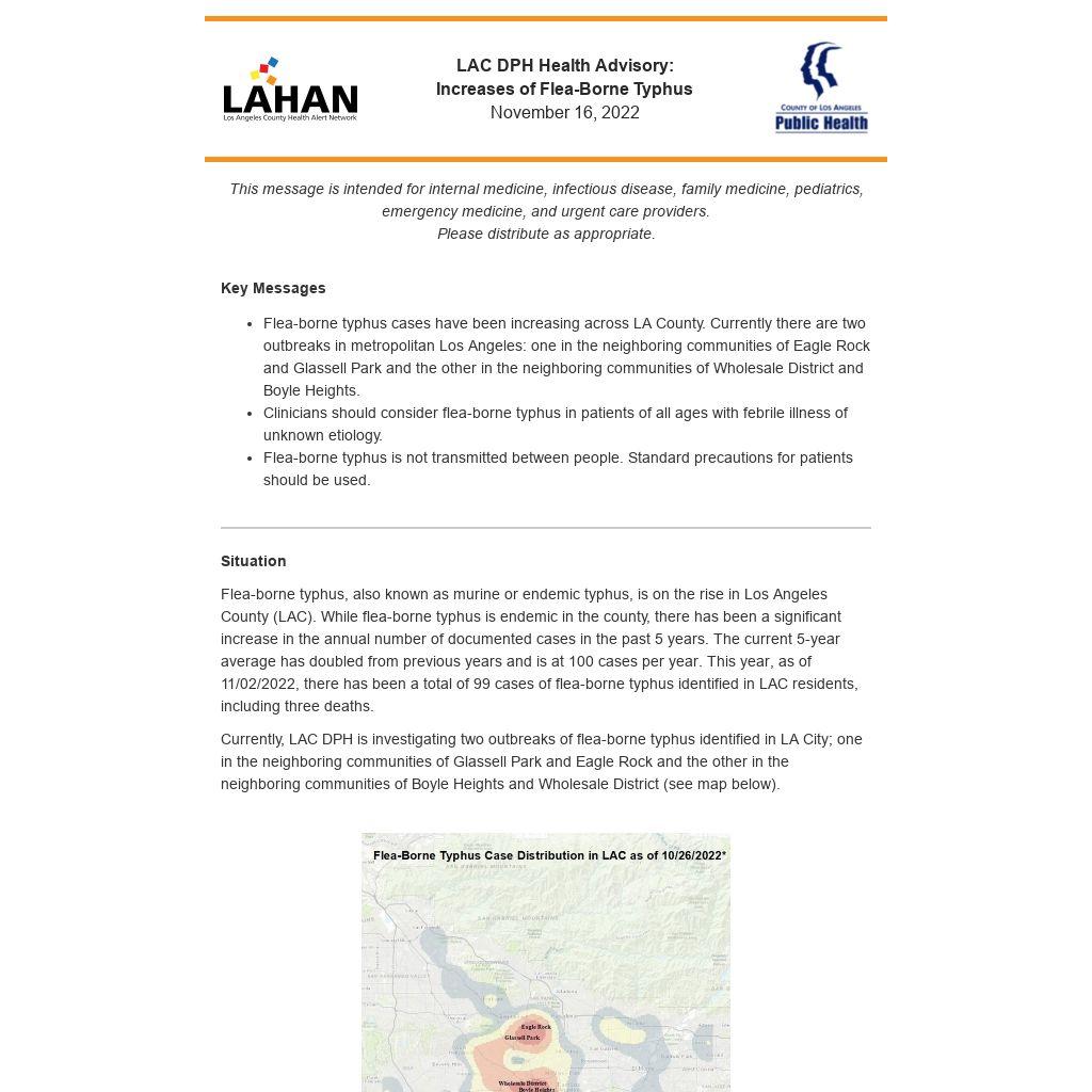 - Flea-borne typhus cases have been increasing across LA County. Currently there are two outbreaks in metropolitan Los Angeles: one in the neighboring communities of Eagle Rock and Glassell Park and the other in the neighboring communities of Wholesale District and Boyle Heights.
