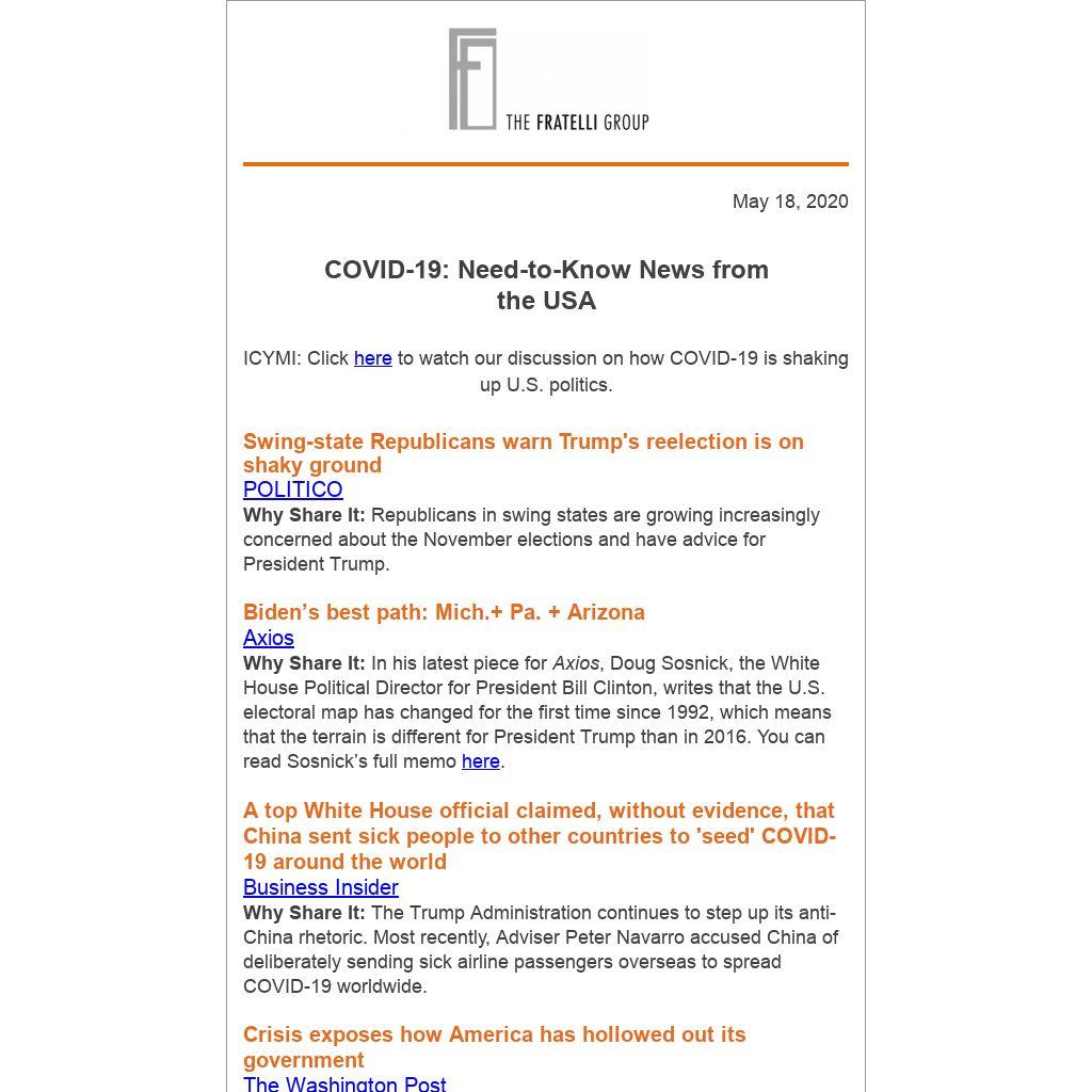 Why Share It: In his latest piece for Axios, Doug Sosnick, the White House Political Director for President Bill Clinton, writes that the U.S. electoral map has changed for the first time since 1992, which means that the terrain is different for President Trump than in 2016. You can read Sosnick’s full memo here.