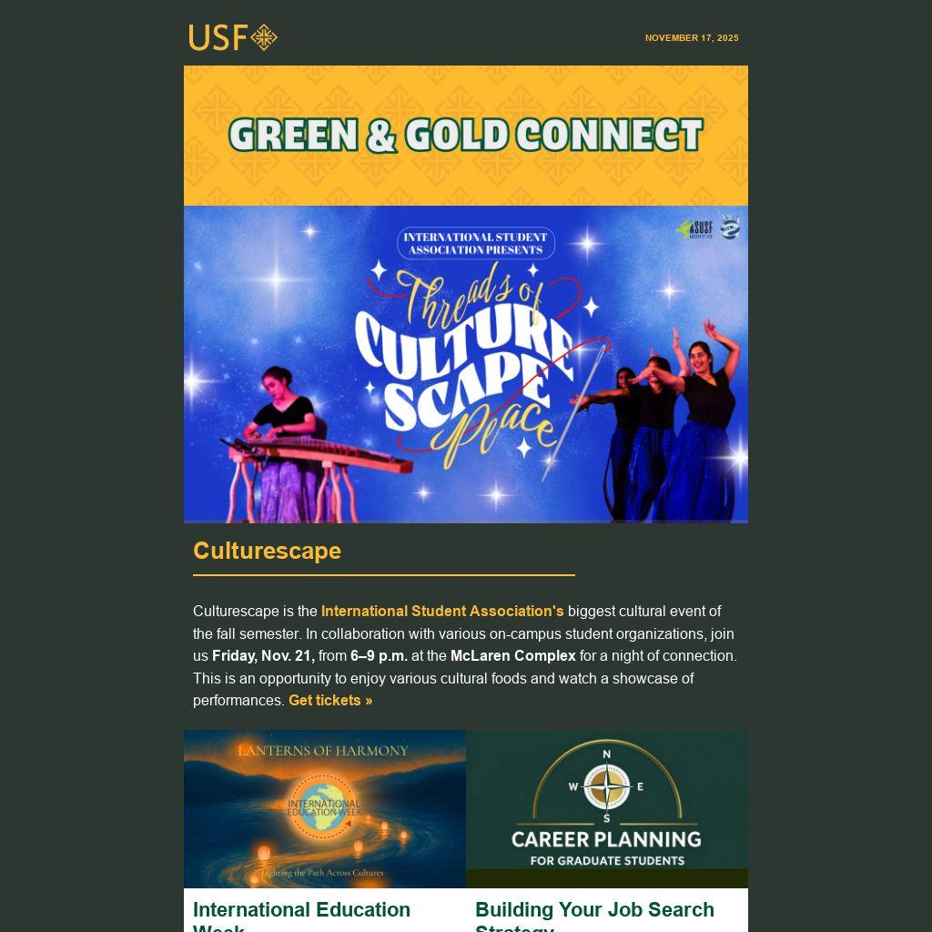 Culturescape is the International Student Association's biggest cultural event of the fall semester. In collaboration with various on-campus student organizations, join us Friday, Nov. 21, from 6–9 p.m. at the McLaren Complex for a night of connection. This is an opportunity to enjoy various cultural foods and watch a showcase of performances. Get tickets »