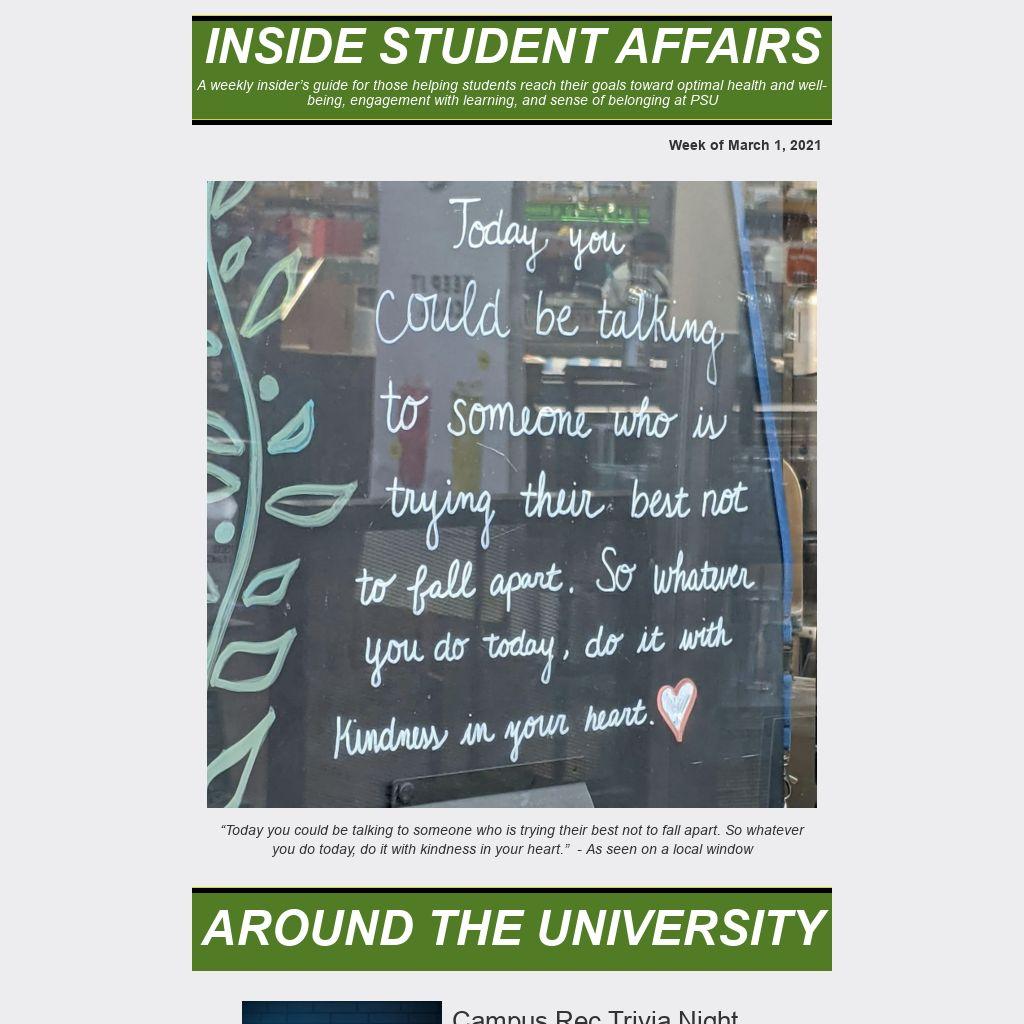INSIDE STUDENT AFFAIRSA weekly insider’s guide for those helping students reach their goals toward optimal health and well-being, engagement with learning, and sense of belonging at PSU