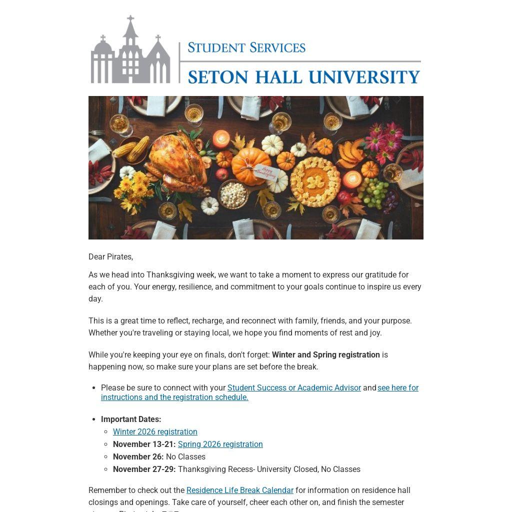 Remember to check out the Residence Life Break Calendar for information on residence hall closings and openings. Take care of yourself, cheer each other on, and finish the semester strong -- Pirate style. 🏴☠️💙