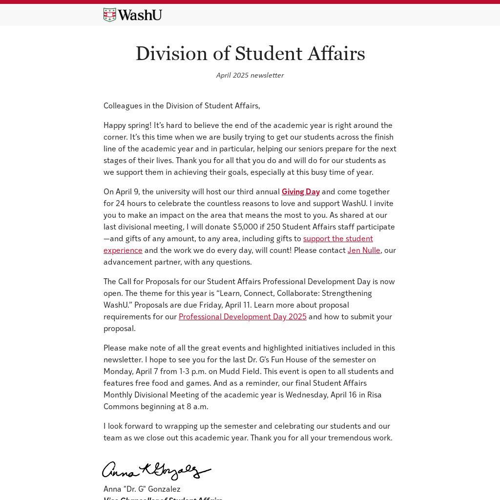 On April 9, the university will host our third annual Giving Day and come together for 24 hours to celebrate the countless reasons to love and support WashU. I invite you to make an impact on the area that means the most to you. As shared at our last divisional meeting, I will donate $5,000 if 250 Student Affairs staff participate—and gifts of any amount, to any area, including gifts to support the student experience and the work we do every day, will count! Please contact Jen Nulle, our advancement partner, with any questions.