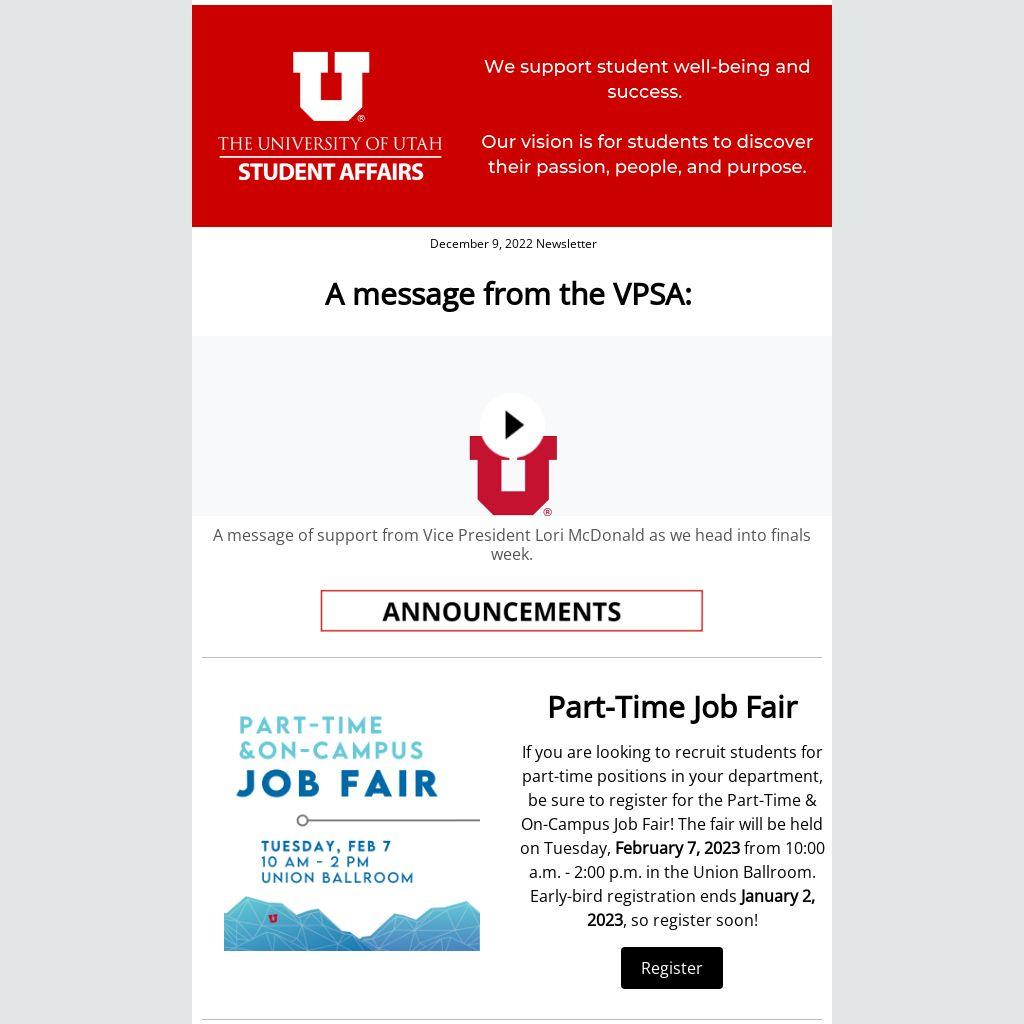 If you are looking to recruit students for part-time positions in your department, be sure to register for the Part-Time & On-Campus Job Fair! The fair will be held on Tuesday, February 7, 2023 from 10:00 a.m. - 2:00 p.m. in the Union Ballroom. Early-bird registration ends January 2, 2023, so register soon!