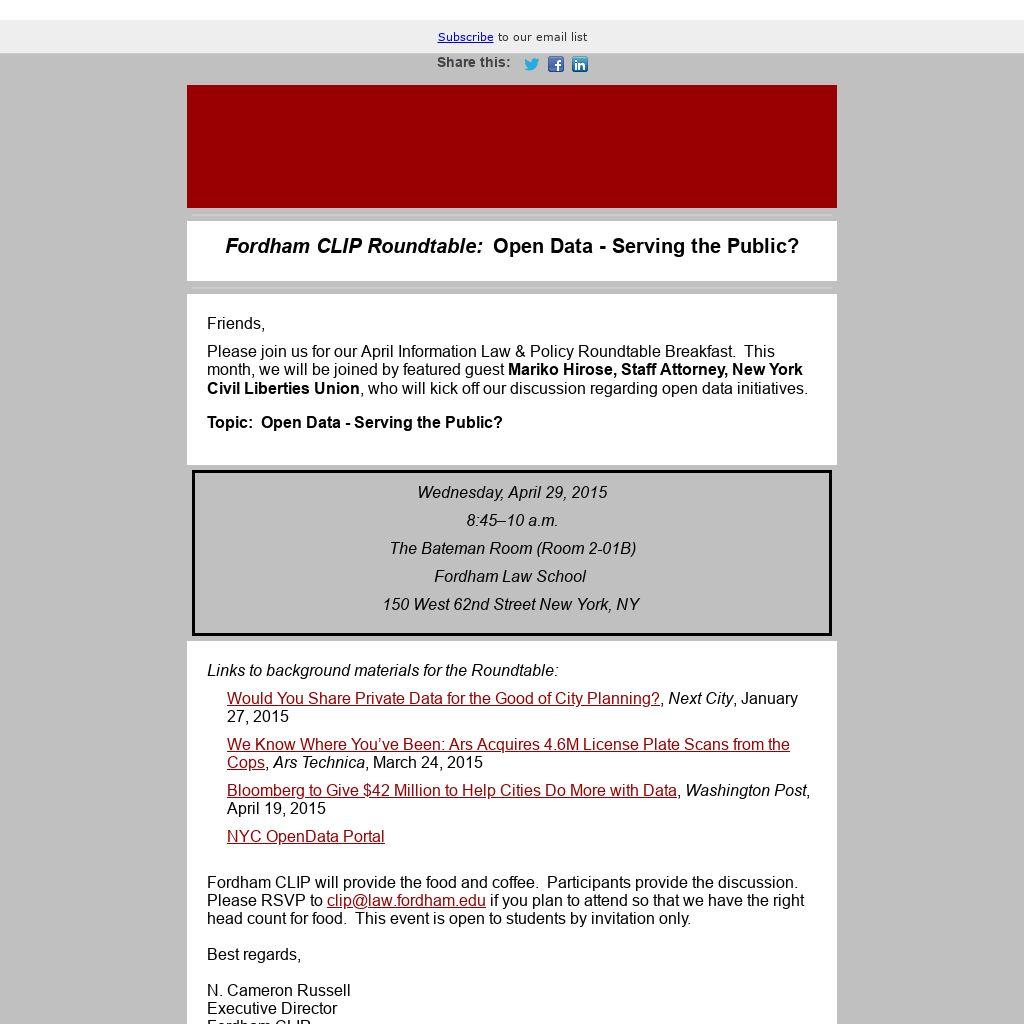 Please join us for our April Information Law & Policy Roundtable Breakfast. This month, we will be joined by featured guest Mariko Hirose, Staff Attorney, New York Civil Liberties Union, who will kick off our discussion regarding open data initiatives.
