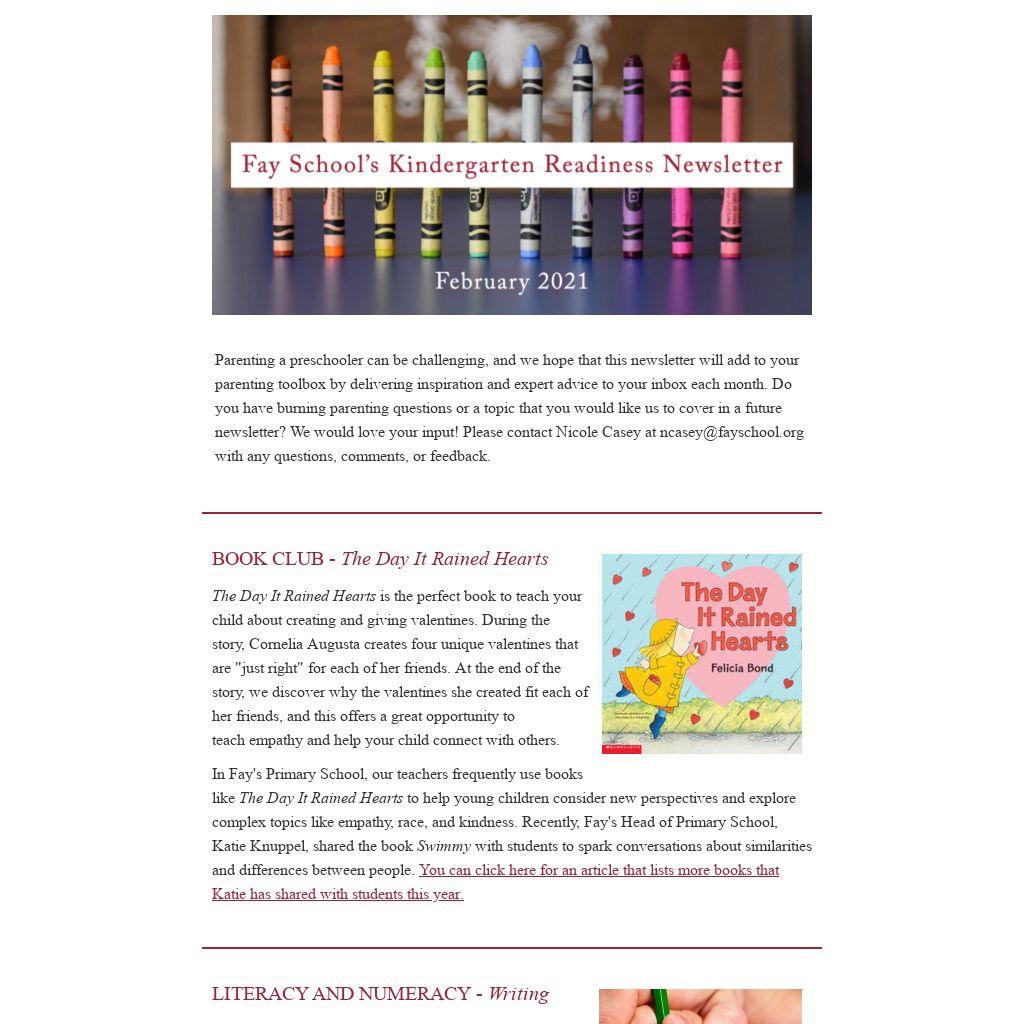 Parenting a preschooler can be challenging, and we hope that this newsletter will add to your parenting toolbox by delivering inspiration and expert advice to your inbox each month. Do you have burning parenting questions or a topic that you would like us to cover in a future newsletter? We would love your input! Please contact Nicole Casey at ncasey@fayschool.org with any questions, comments, or feedback.