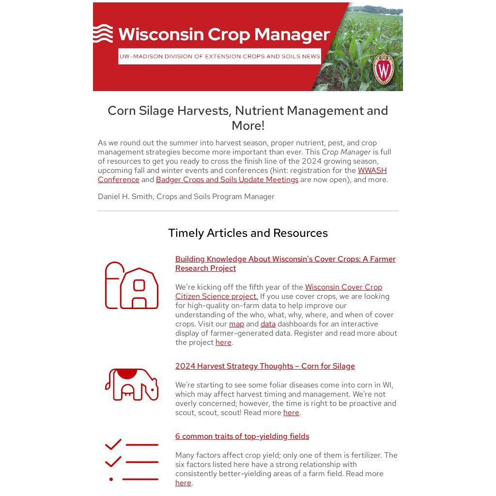 As we round out the summer into harvest season, proper nutrient, pest, and crop management strategies become more important than ever. This Crop Manager is full of resources to get you ready to cross the finish line of the 2024 growing season, upcoming fall and winter events and conferences (hint: registration for the WWASH Conference and Badger Crops and Soils Update Meetings are now open), and more.