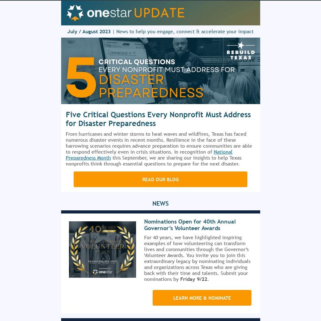We want to extend sincere thanks to our colleagues and stakeholders who completed surveys this month as part of OneStar's strategic planning journey. We appreciate your honest feedback and are delving deep into the responses to ensure our next steps as an organization provide meaningful support and value to your work strengthening Texas communities!