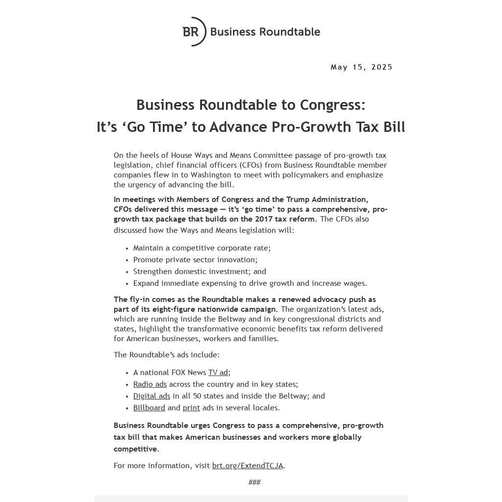 On the heels of House Ways and Means Committee passage of pro-growth tax legislation, chief financial officers (CFOs) from Business Roundtable member companies flew in to Washington to meet with policymakers and emphasize the urgency of advancing the bill.