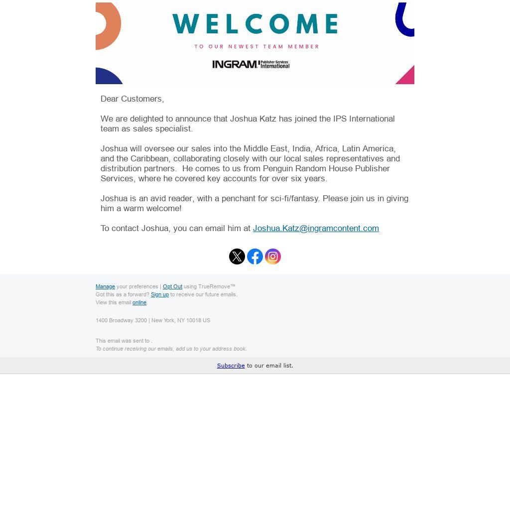 To contact Joshua, you can email him at Joshua.Katz@ingramcontent.com