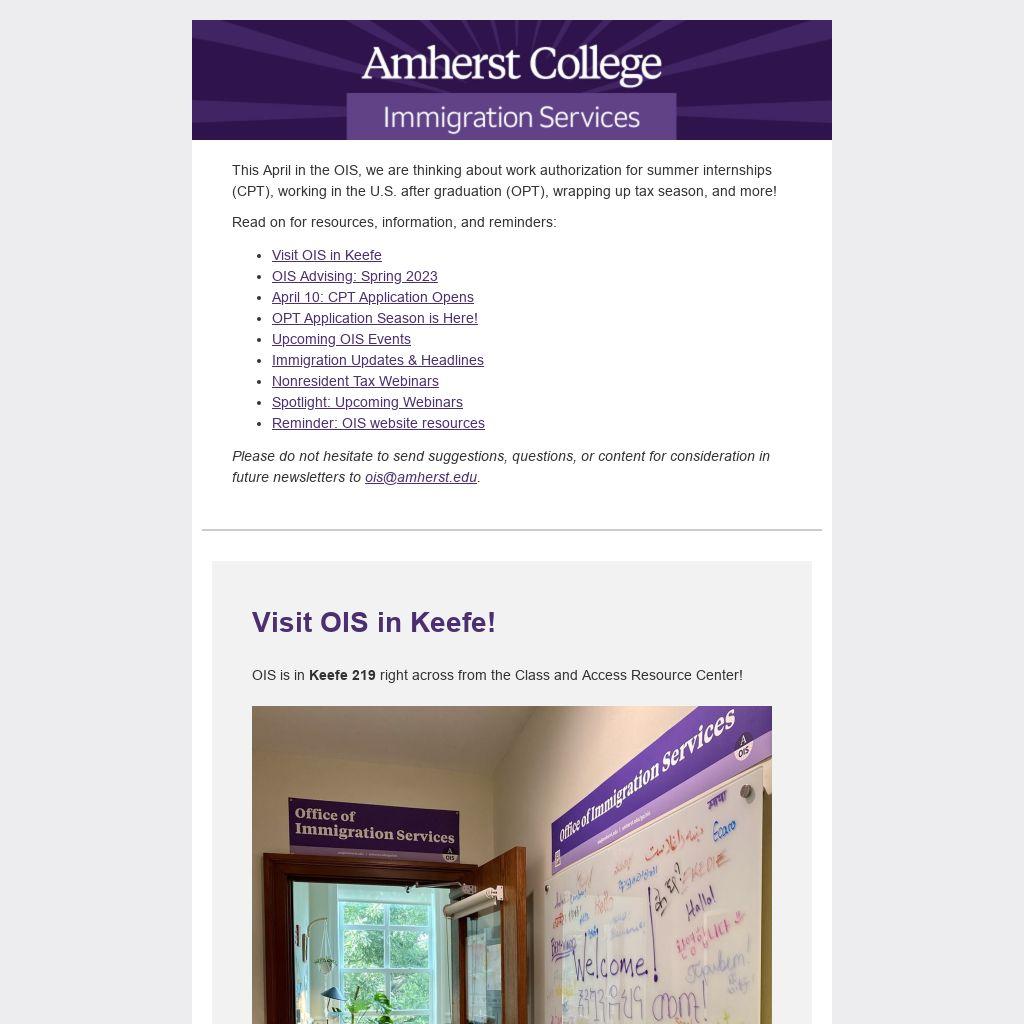 Please do not hesitate to send suggestions, questions, or content for consideration in future newsletters to ois@amherst.edu.