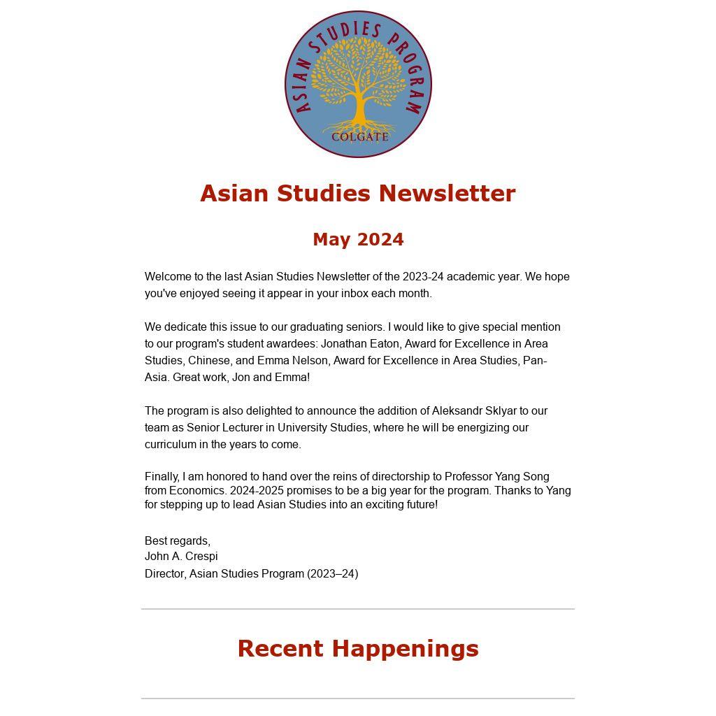 Welcome to the last Asian Studies Newsletter of the 2023-24 academic year. We hope you've enjoyed seeing it appear in your inbox each month.