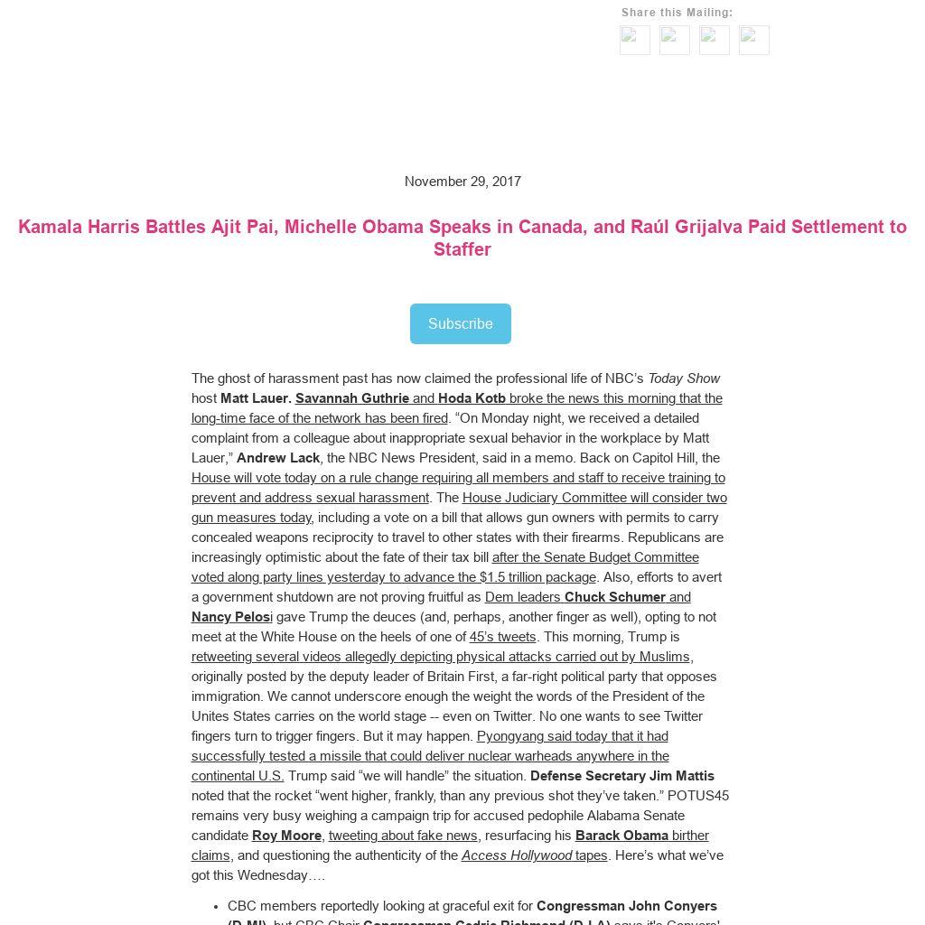 The ghost of harassment past has now claimed the professional life of NBC’s Today Show host Matt Lauer. Savannah Guthrie and Hoda Kotb broke the news this morning that the long-time face of the network has been fired. “On Monday night, we received a detailed complaint from a colleague about inappropriate sexual behavior in the workplace by Matt Lauer,” Andrew Lack, the NBC News President, said in a memo. Back on Capitol Hill, the House will vote today on a rule change requiring all members and staff to receive training to prevent and address sexual harassment. The House Judiciary Committee will consider two gun measures today, including a vote on a bill that allows gun owners with permits to carry concealed weapons reciprocity to travel to other states with their firearms. Republicans are increasingly optimistic about the fate of their tax bill after the Senate Budget Committee voted along party lines yesterday to advance the $1.5 trillion package. Also, efforts to avert a government shutdown are not proving fruitful as Dem leaders Chuck Schumer and Nancy Pelosi gave Trump the deuces (and, perhaps, another finger as well), opting to not meet at the White House on the heels of one of 45’s tweets. This morning, Trump is retweeting several videos allegedly depicting physical attacks carried out by Muslims, originally posted by the deputy leader of Britain First, a far-right political party that opposes immigration. We cannot underscore enough the weight the words of the President of the Unites States carries on the world stage -- even on Twitter. No one wants to see Twitter fingers turn to trigger fingers. But it may happen. Pyongyang said today that it had successfully tested a missile that could deliver nuclear warheads anywhere in the continental U.S. Trump said “we will handle” the situation. Defense Secretary Jim Mattis noted that the rocket “went higher, frankly, than any previous shot they’ve taken.” POTUS45 remains very busy weighing a campaign trip for accused pedophile Alabama Senate candidate Roy Moore, tweeting about fake news, resurfacing his Barack Obama birther claims, and questioning the authenticity of the Access Hollywood tapes. Here’s what we’ve got this Wednesday….
