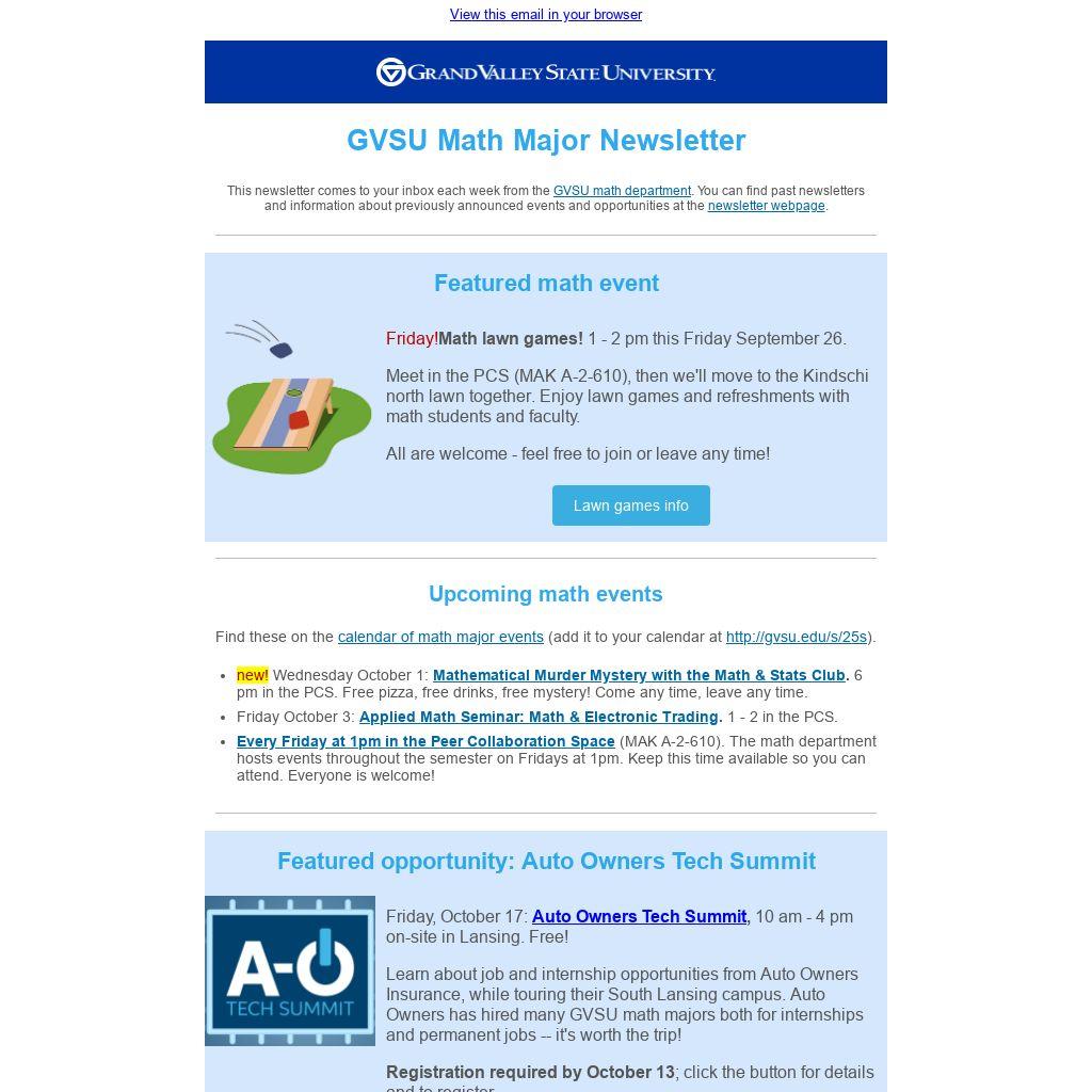 This newsletter comes to your inbox each week from the GVSU math department. You can find past newsletters and information about previously announced events and opportunities at the newsletter webpage.