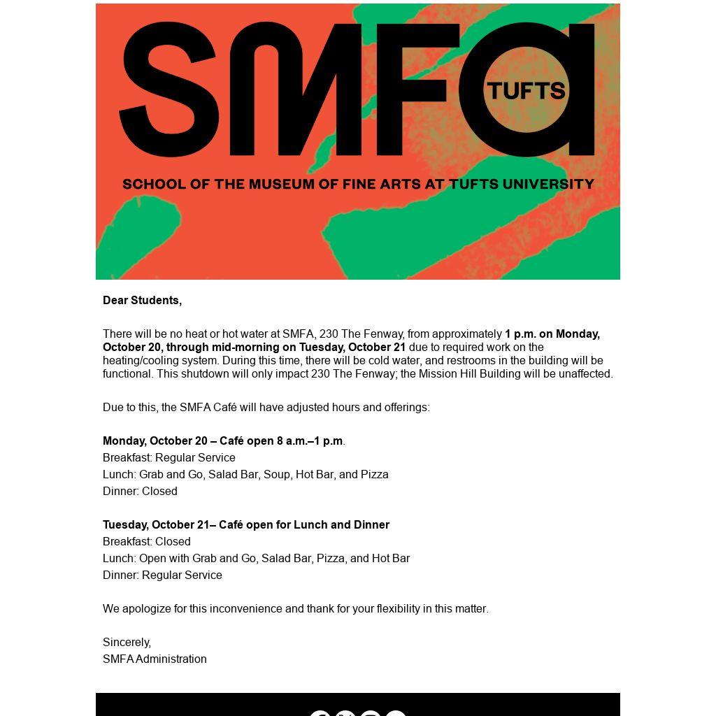There will be no heat or hot water at SMFA, 230 The Fenway, from approximately 1 p.m. on Monday, October 20, through mid-morning on Tuesday, October 21 due to required work on the heating/cooling system. During this time, there will be cold water, and restrooms in the building will be functional. This shutdown will only impact 230 The Fenway; the Mission Hill Building will be unaffected.