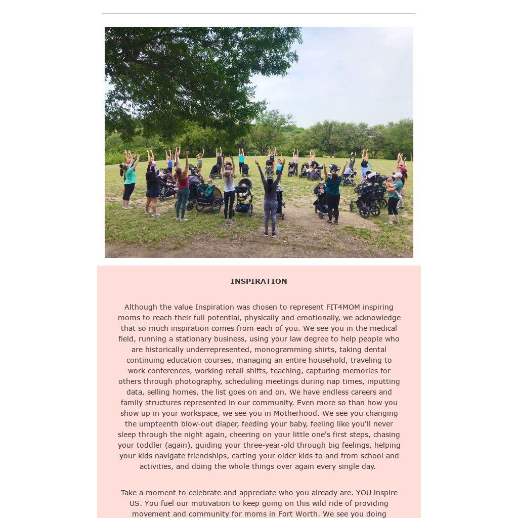 Although the value Inspiration was chosen to represent FIT4MOM inspiring moms to reach their full potential, physically and emotionally, we acknowledge that so much inspiration comes from each of you. We see you in the medical field, running a stationary business, using your law degree to help people who are historically underrepresented, monogramming shirts, taking dental continuing education courses, managing an entire household, traveling to work conferences, working retail shifts, teaching, capturing memories for others through photography, scheduling meetings during nap times, inputting data, selling homes, the list goes on and on. We have endless careers and family structures represented in our community. Even more so than how you show up in your workspace, we see you in Motherhood. We see you changing the umpteenth blow-out diaper, feeding your baby, feeling like you'll never sleep through the night again, cheering on your little one's first steps, chasing your toddler (again), guiding your three-year-old through big feelings, helping your kids navigate friendships, carting your older kids to and from school and activities, and doing the whole things over again every single day.