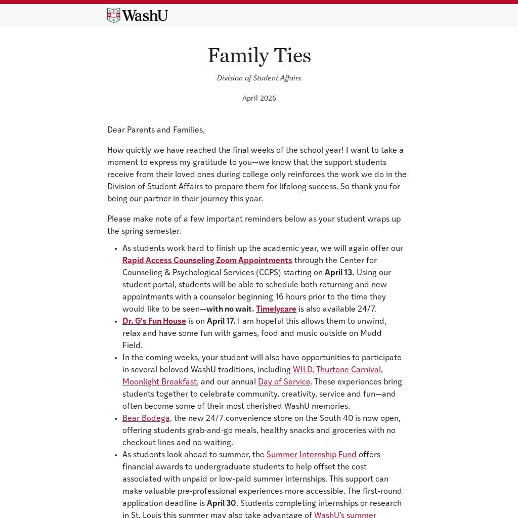 How quickly we have reached the final weeks of the school year! I want to take a moment to express my gratitude to you—we know that the support students receive from their loved ones during college only reinforces the work we do in the Division of Student Affairs to prepare them for lifelong success. So thank you for being our partner in their journey this year.