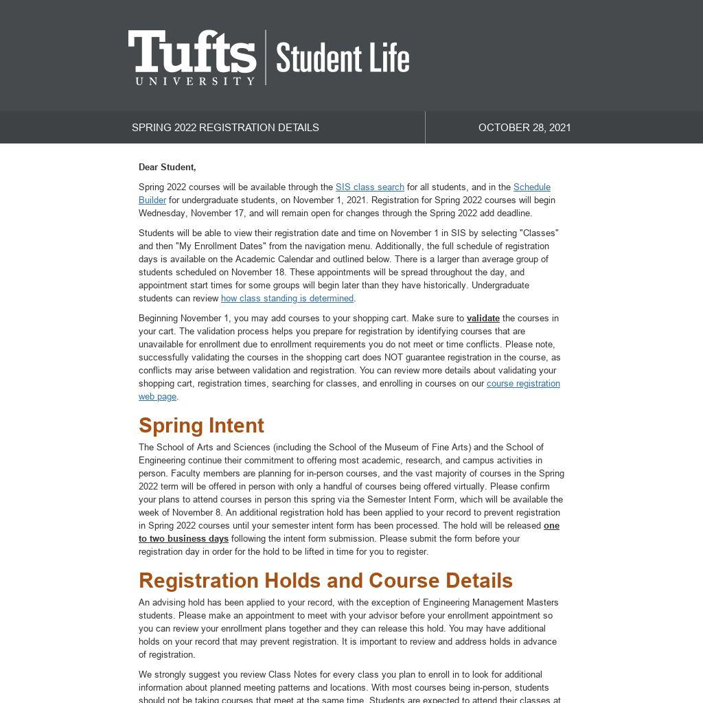 - November 18 – Spring 2022 registration for all engineers, BFA, SMFA and NEC combined-degree students, and rising LA Seniors, including 5th years (first- or second-semester senior in spring 2022)