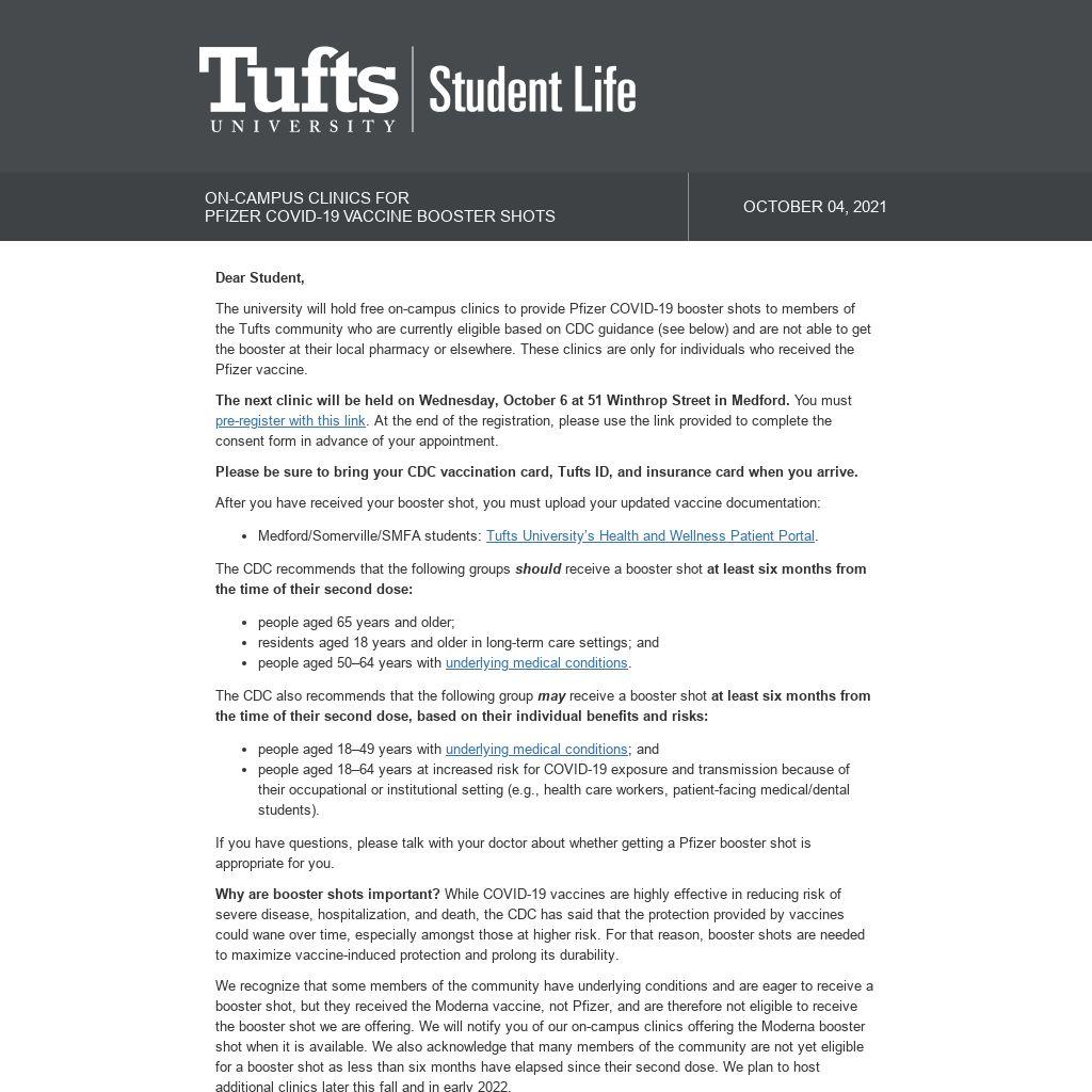 The university will hold free on-campus clinics to provide Pfizer COVID-19 booster shots to members of the Tufts community who are currently eligible based on CDC guidance (see below) and are not able to get the booster at their local pharmacy or elsewhere. These clinics are only for individuals who received the Pfizer vaccine.