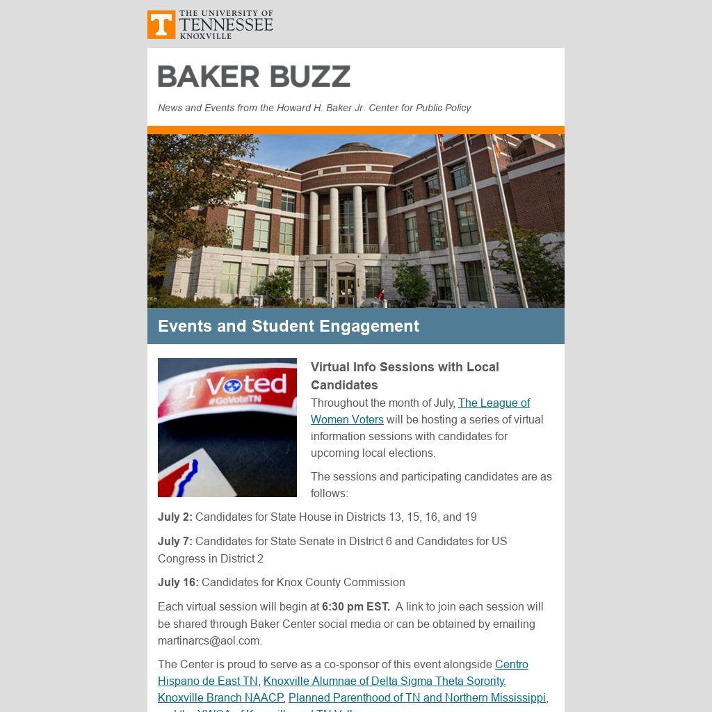 The Center is a home for civic engagement for students in all disciplines and at all levels. Through programs, events and lectures, and helpful faculty and staff, the Center aims to engage the community on the topics of Global Security, Leadership & Governance, and Energy & Environment. Learn more at bakercenter.utk.edu.