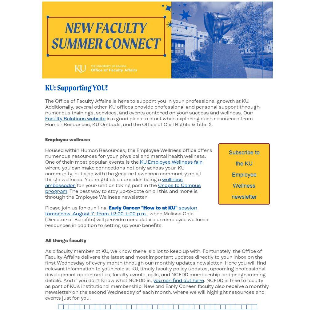Please join us for our final Early Career "How to at KU" session tomorrow, August 7, from 12:00-1:00 p.m., when Melissa Cole (Director of Benefits) will provide more details on employee wellness resources in addition to setting up your benefits.