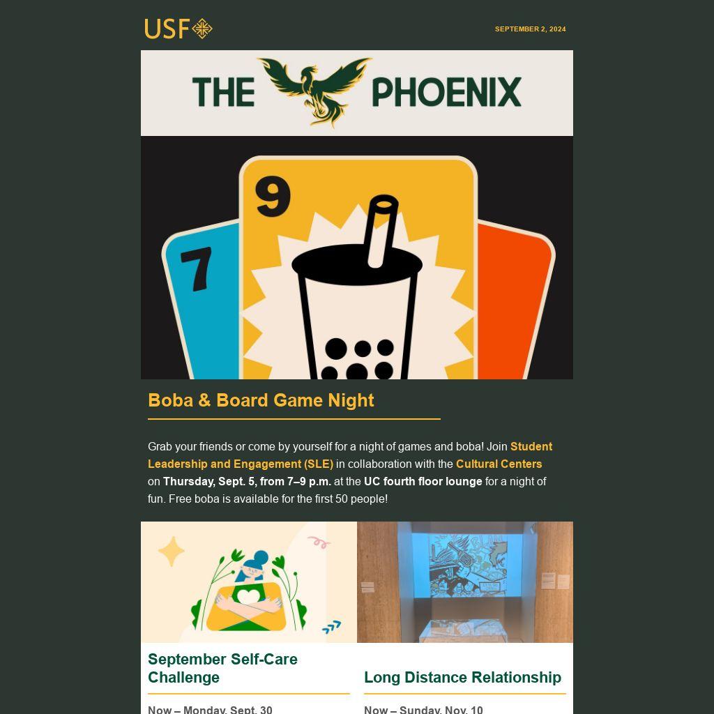 The Phoenix is a weekly e-newsletter sent by Student Leadership and Engagement to help students stay connected and get involved. It features campus events, leadership opportunities, athletic games, workshops, retreats, and more. Why “The Phoenix” title? The Phoenix has long been associated with the history and growth of USF as well as St. Ignatius, who encouraged followers to “go forth and set the world on fire.” Learn more »