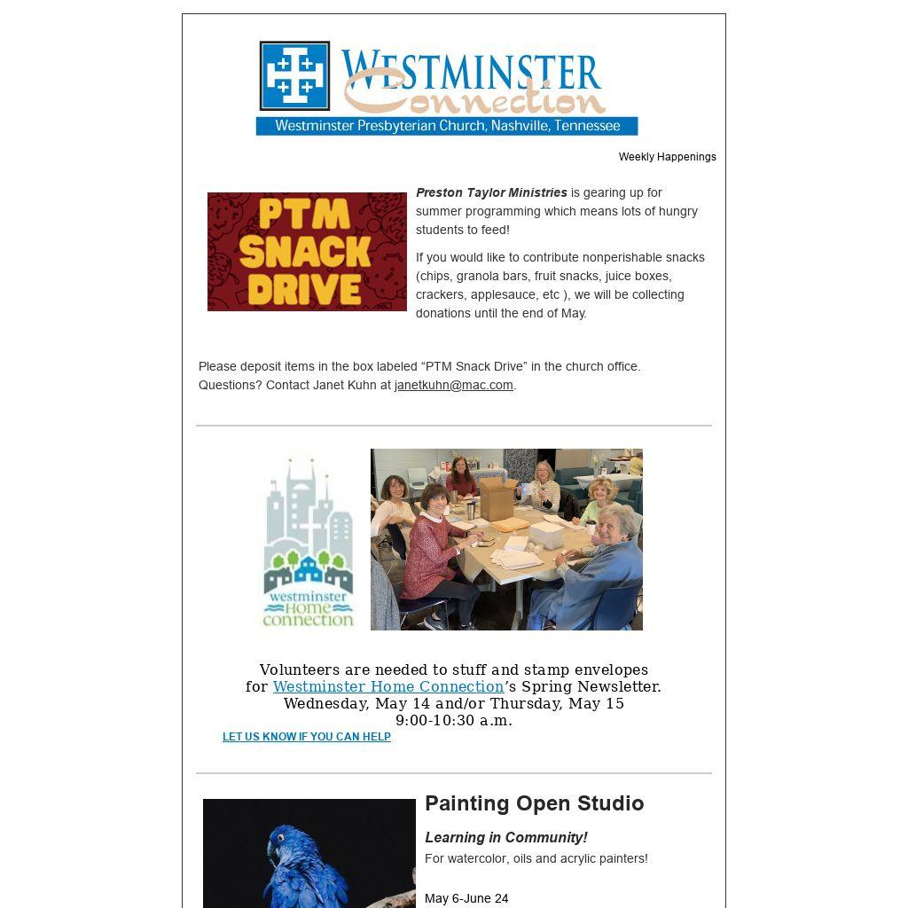 Please deposit items in the box labeled “PTM Snack Drive” in the church office. Questions? Contact Janet Kuhn at janetkuhn@mac.com.