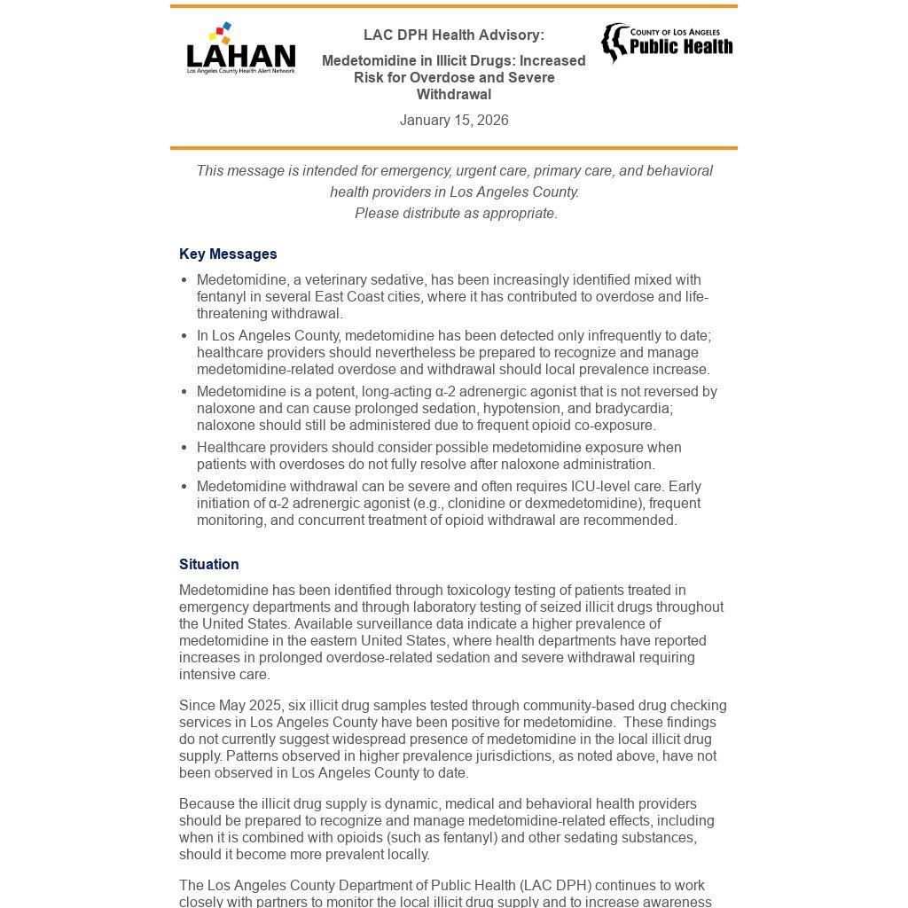 - In Los Angeles County, medetomidine has been detected only infrequently to date; healthcare providers should nevertheless be prepared to recognize and manage medetomidine-related overdose and withdrawal should local prevalence increase.