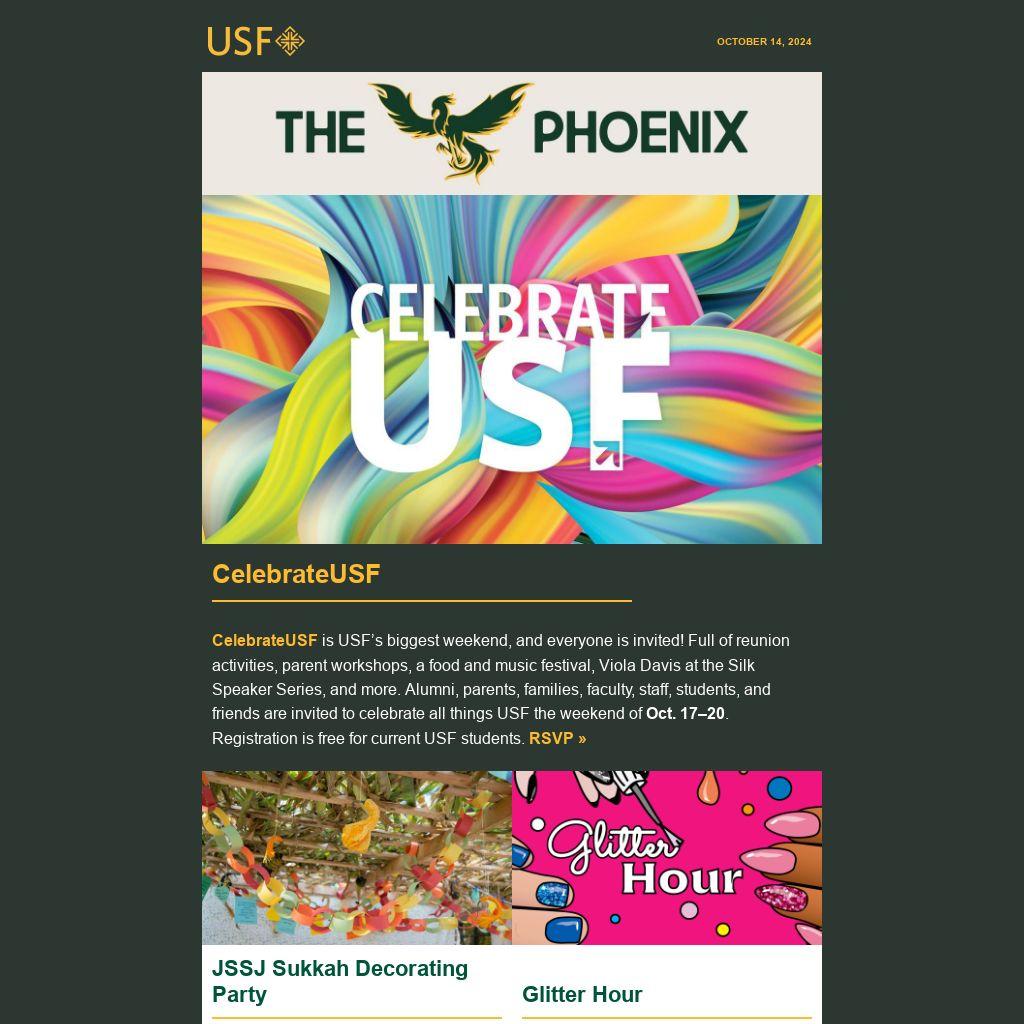The Phoenix is a weekly e-newsletter sent by Student Leadership and Engagement to help students stay connected and get involved. It features campus events, leadership opportunities, athletic games, workshops, retreats, and more. Why “The Phoenix” title? The Phoenix has long been associated with the history and growth of USF as well as St. Ignatius, who encouraged followers to “go forth and set the world on fire.” Learn more »