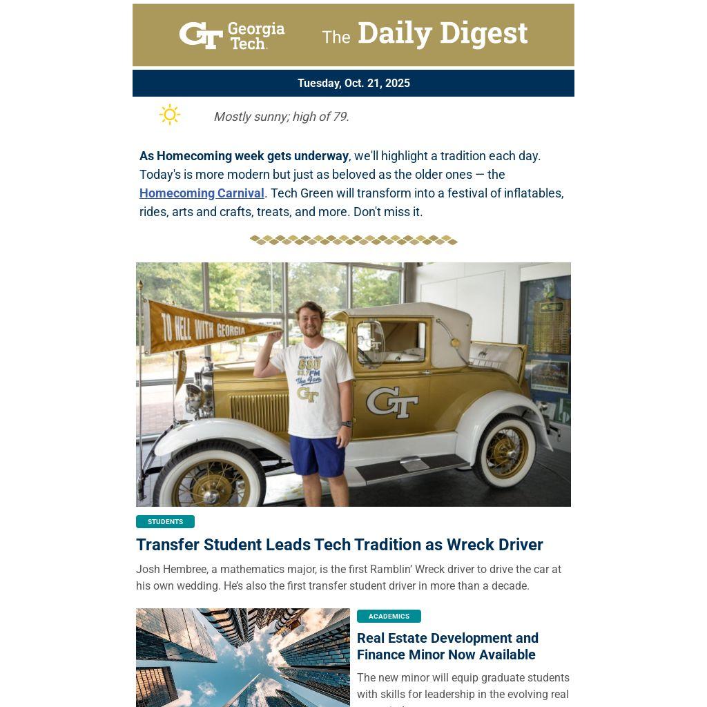 As Homecoming week gets underway, we'll highlight a tradition each day. Today's is more modern but just as beloved as the older ones — the Homecoming Carnival. Tech Green will transform into a festival of inflatables, rides, arts and crafts, treats, and more. Don't miss it.