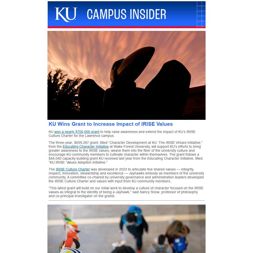 The three-year, $699,287 grant, titled “Character Development at KU: The IRISE Virtues Initiative,” from the Educating Character Initiative at Wake Forest University, will support KU’s efforts to bring greater awareness to the IRISE values, weave them into the fiber of the university culture and encourage KU community members to cultivate character within themselves. The grant follows a $46,040 capacity-building grant KU received last year from the Educating Character Initiative, titled “KU IRISE: Values Adoption Initiative.”