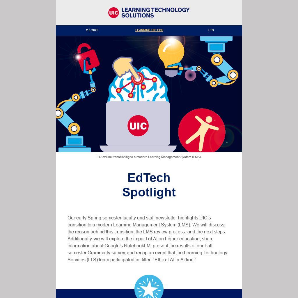 Our early Spring semester faculty and staff newsletter highlights UIC’s transition to a modern Learning Management System (LMS). We will discuss the reason behind this transition, the LMS review process, and the next steps. Additionally, we will explore the impact of AI on higher education, share information about Google's NotebookLM, present the results of our Fall semester Grammarly survey, and recap an event that the Learning Technology Services (LTS) team participated in, titled "Ethical AI in Action."