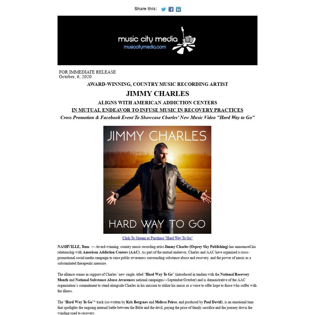 His journey has led him to utilize his platforms to further his purpose in the fight against cancer. As the brainchild and spearhead of the I Am Not Alone 501c3 non-profit organization (founded to spread hope, strength and unity to survivors), Jimmy creates powerful music with the objective to cultivate a “you are not alone” community and support system. His philanthropic passion and commitment in this endeavor led him to earn the “Outstanding Young Tennessean” Award (2017) and “Top Ten Outstanding Young Americans” Award (2019). A NIMA Winner, Jimmy was presented the award for "Male Country Artist Of The Year" and "Song Of The Year” (2020).
