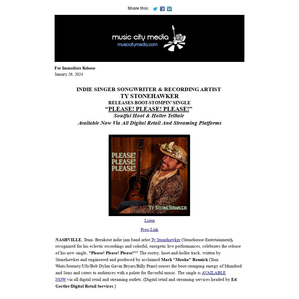 NASHVILLE, Tenn- Breakout indie jam band artist Ty Stonehawker (Stonehouse Entertainment), recognized for his eclectic recordings and colorful, energetic live performances, celebrates the release of his new single, "Please! Please! Please!"* The rootsy, hoot-and-holler track, written by Stonehawker and engineered and produced by acclaimed Mark “Mooka'' Rennick (Tom Waits/Journey/Ufo/Bob Dylan Gavin Bryars/Billy Prine) rouses the boot-stomping energy of Mumford and Sons and caters to audiences with a palate for flavorful music. The single is AVAILABLE NOW via all digital retail and streaming outlets. (Digital retail and streaming services headed by Ed Gertler/Digital Retail Services.)