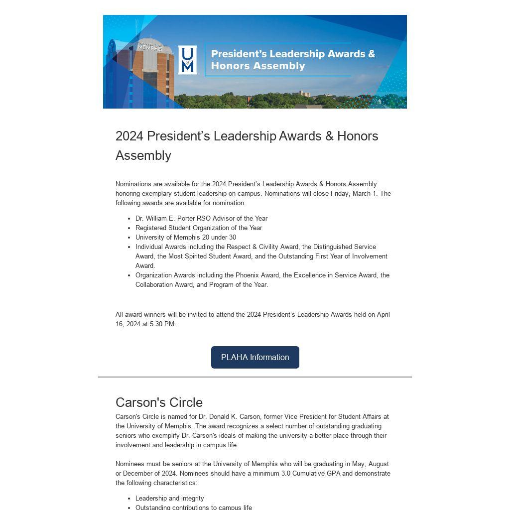 Carson's Circle is named for Dr. Donald K. Carson, former Vice President for Student Affairs at the University of Memphis. The award recognizes a select number of outstanding graduating seniors who exemplify Dr. Carson's ideals of making the university a better place through their involvement and leadership in campus life.