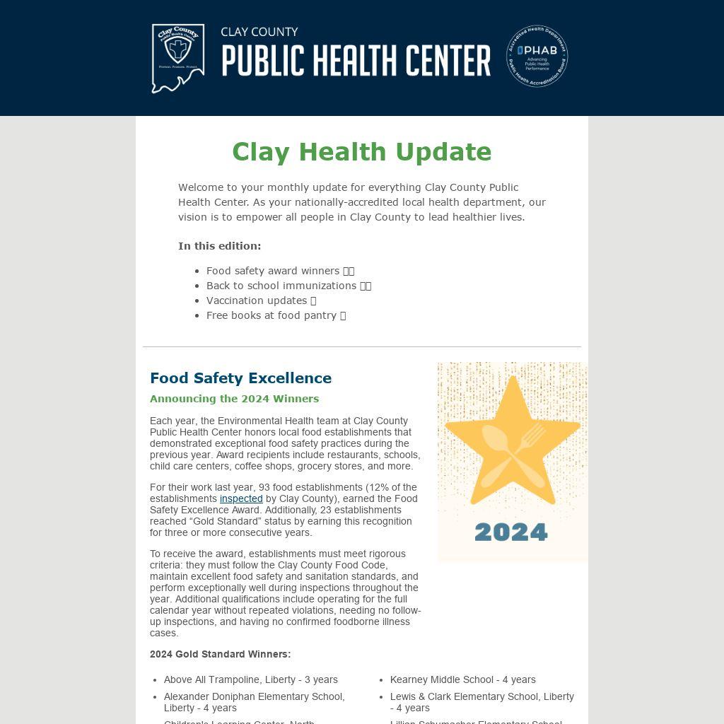 Welcome to your monthly update for everything Clay County Public Health Center. As your nationally-accredited local health department, our vision is to empower all people in Clay County to lead healthier lives.