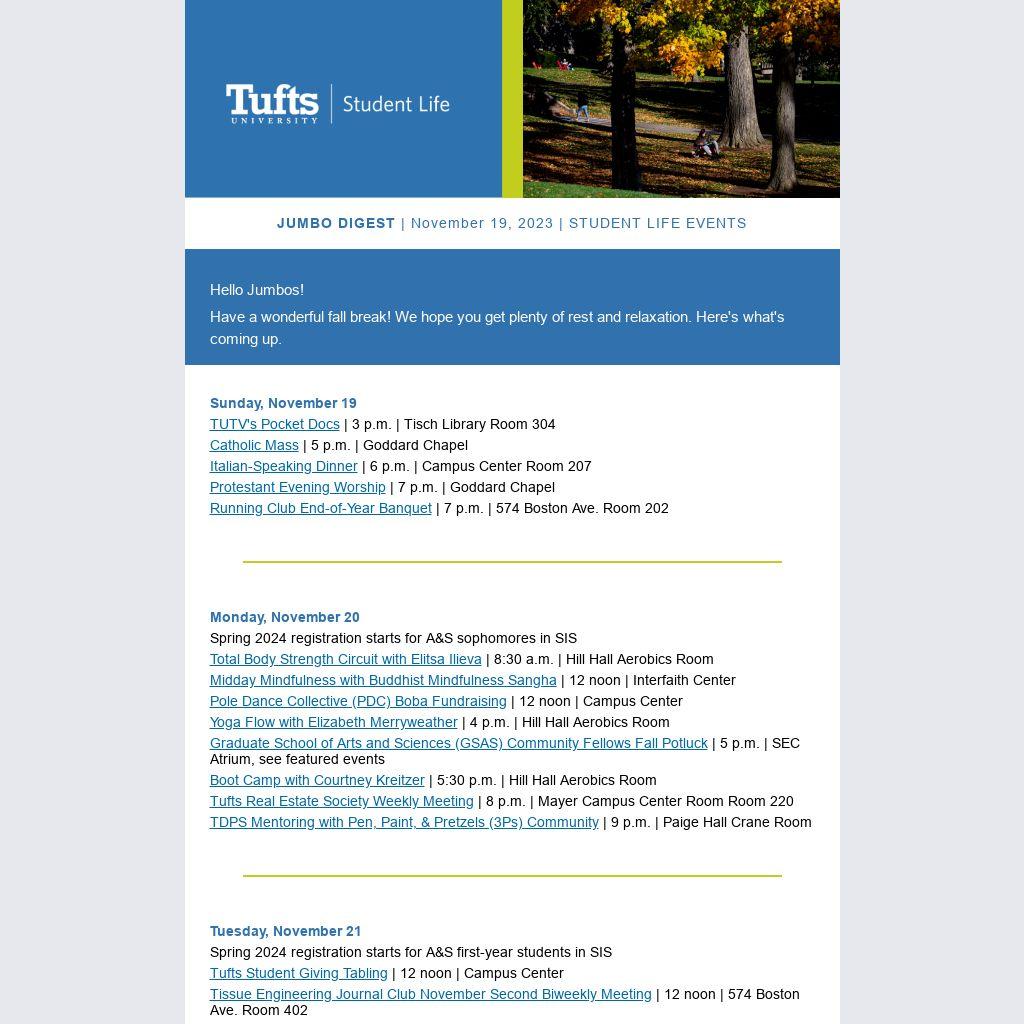 Students and Student Organizations can submit events to JumboLife! Add your event by Thursday at 12 noon each week, and we'll include it in the Jumbo Digest on Sunday.