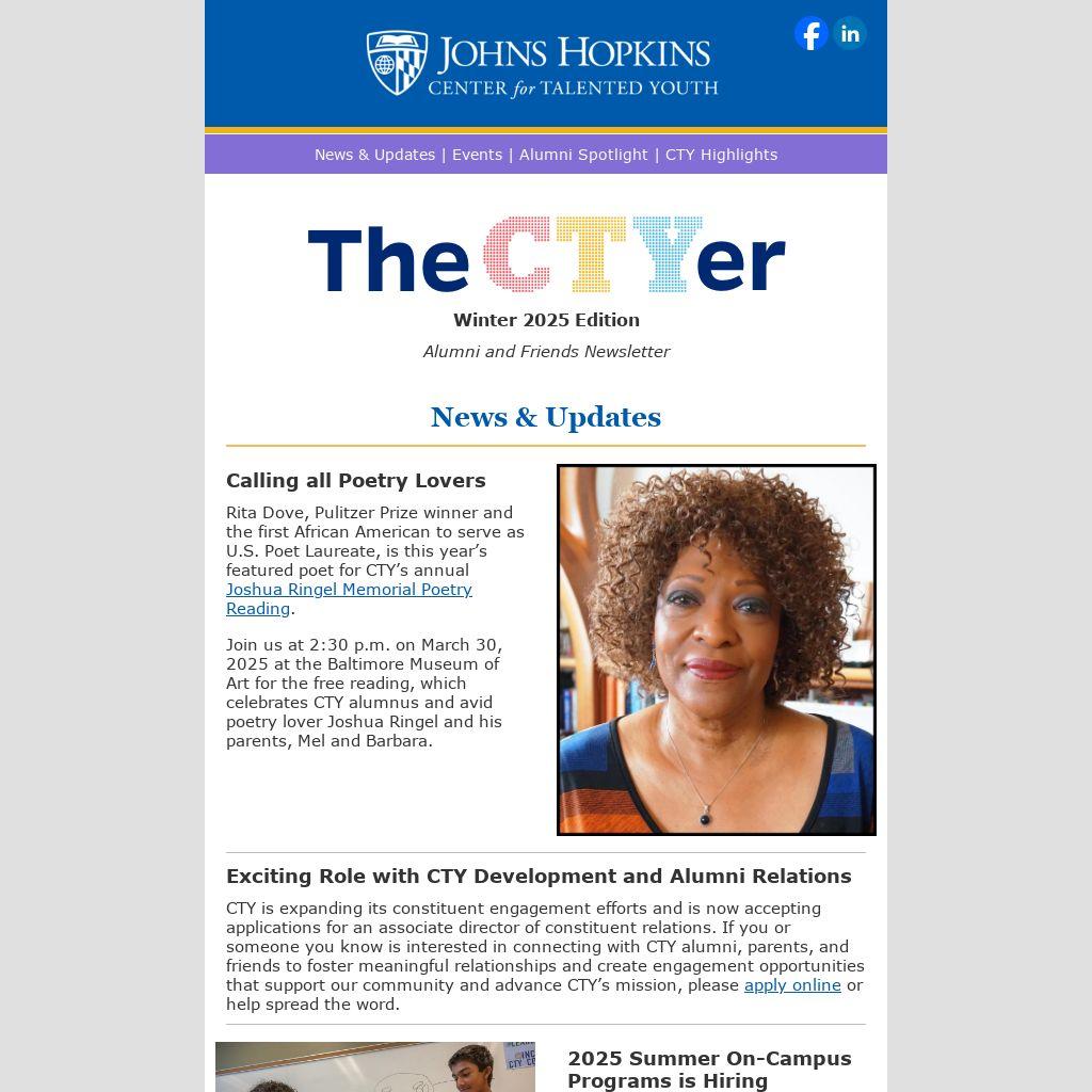 Attendees will have an opportunity to connect with CTY Executive Director Amy Lynne Shelton, PhD, and hear from JHU President Ron Daniels. More details coming soon!