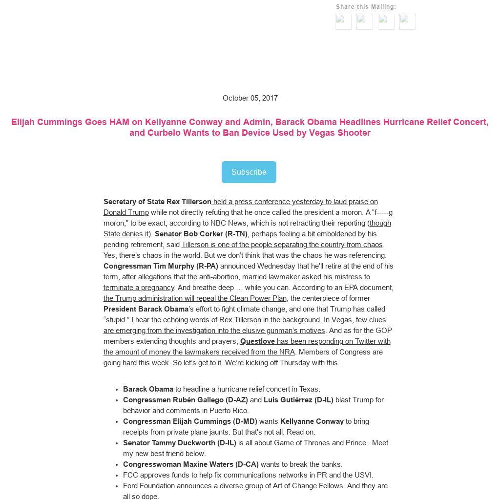 Secretary of State Rex Tillerson held a press conference yesterday to laud praise on Donald Trump while not directly refuting that he once called the president a moron. A “f-----g moron,” to be exact, according to NBC News, which is not retracting their reporting (though State denies it). Senator Bob Corker (R-TN), perhaps feeling a bit emboldened by his pending retirement, said Tillerson is one of the people separating the country from chaos. Yes, there’s chaos in the world. But we don’t think that was the chaos he was referencing. Congressman Tim Murphy (R-PA) announced Wednesday that he’ll retire at the end of his term, after allegations that the anti-abortion, married lawmaker asked his mistress to terminate a pregnancy. And breathe deep … while you can. According to an EPA document, the Trump administration will repeal the Clean Power Plan, the centerpiece of former President Barack Obama’s effort to fight climate change, and one that Trump has called “stupid.” I hear the echoing words of Rex Tillerson in the background. In Vegas, few clues are emerging from the investigation into the elusive gunman’s motives. And as for the GOP members extending thoughts and prayers, Questlove has been responding on Twitter with the amount of money the lawmakers received from the NRA. Members of Congress are going hard this week. So let’s get to it. We’re kicking off Thursday with this...